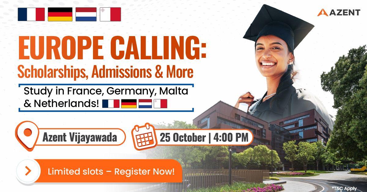Say Bonjour, Hallo, Hola & Ciao to global opportunities and life-changing experiences! Discover top universities, explore scholarships, and plan your study journey across France, Germany, Malta and Netherlands. Event Details: Date: 25th October 2025 Time: 4PM - 5PM Venue:Azent Vijayawada, 1st Floor, Sri Pothuri Towers, MG Rd, opposite D.V Manor Hotel, Vijayawada, Andhra Pradesh 520010 About the Event: At Azent Vijayawada, you can: